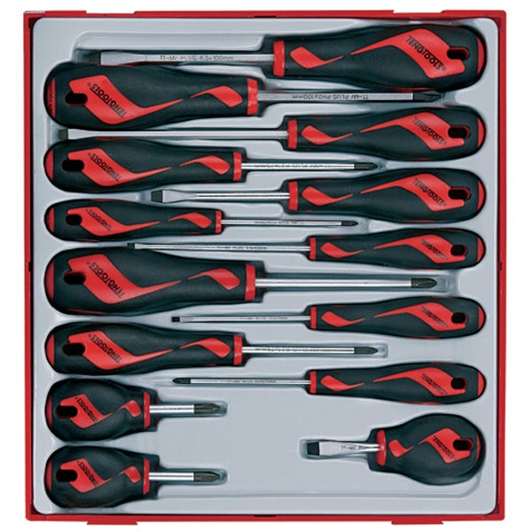 Set of 14 screwdrivers including flat as well as Phillips and Pozidriv tips. With shafts of TT-MV PLUS steel. Ergonomically designed two component handles with hanging hole.